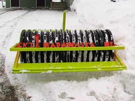 2010 saw the Four Seasons Association purchased a used 2005 Alpina Sherpa and a used 9’ Yellowstone ginzu drag. This is now our primary groomer for most of our trails, including grooming our large start area. In addition the trails are also groomed with two wide-track (20”) snowmobiles: 2005 Polaris Wide-Track owned by the Town of Madawaska and a 2001 Ski-Doo Skandic owned by Ski Trax (this machine was provided by the Maine Winter Sports Center in 2002). A variety of drags are used to create our skate lane and classic tracks including: 72” Snowmaster drag and Trakor track setter owned by the town of Madawaska. Over the years Ski Trax has purchased or constructed the following: a 4’ wide cutter drag, 4’ and 6’ wide compactor drags with adjustable cutter bars and track setting capability, along with a roller compactor pictured below.